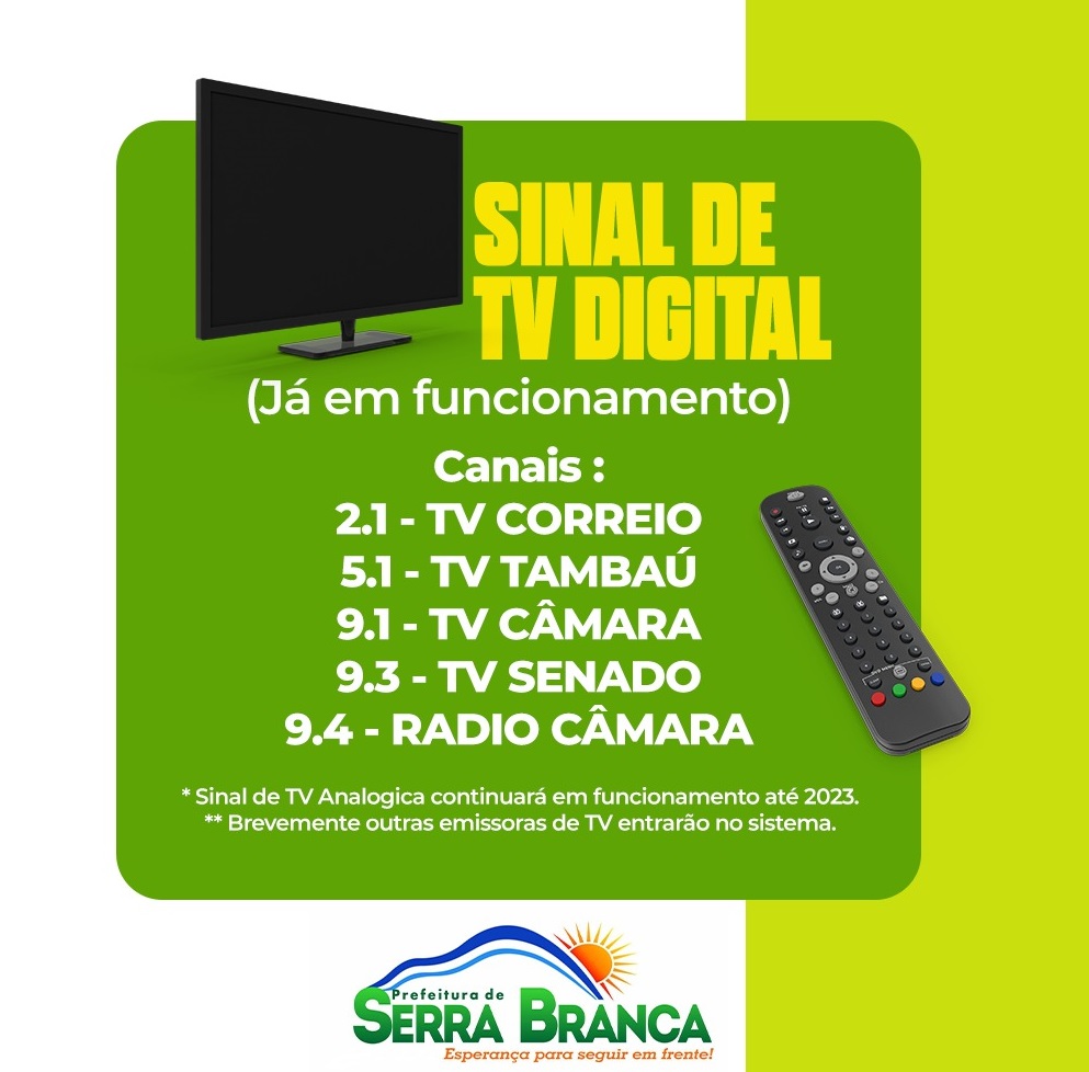 Na cidade de Serra Branca já está aberto o sinal de TV digital. Já estão disponíveis da população os canais digitais da TV Correio (2.1), TV Tambaú, (5.1), TV Câmara (9.1), TV Senado (9.3) e Rádio Câmara e em breve novos canais estarão em funcionamento.
