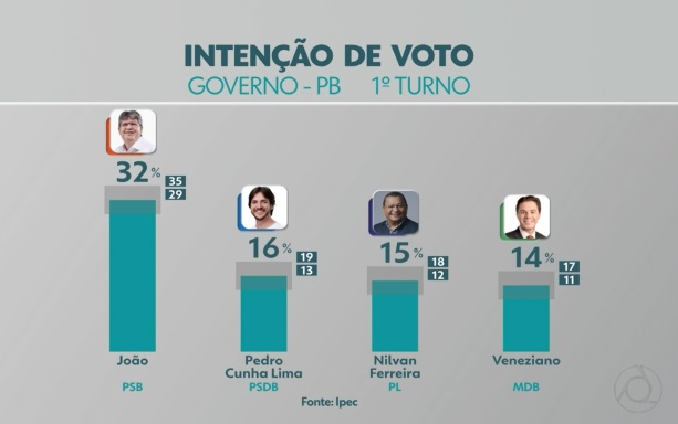 Em segundo lugar aparece Pedro Cunha Lima (PSDB), com 16%. Nilvan Ferreira (PL) figura em terceiro, com 15%, e Veneziano Vital, com 14%, em quarto lugar.