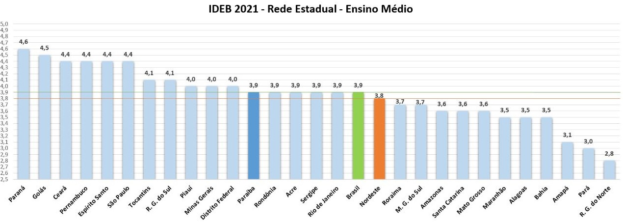 No ranking dos estados, a Paraíba subiu de 17º para 12º lugar na classificação nacional. A nota paraibana ficou acima da média do Nordeste e da média nacional, o que demonstra a evolução do ensino médio na rede estadual de ensino.