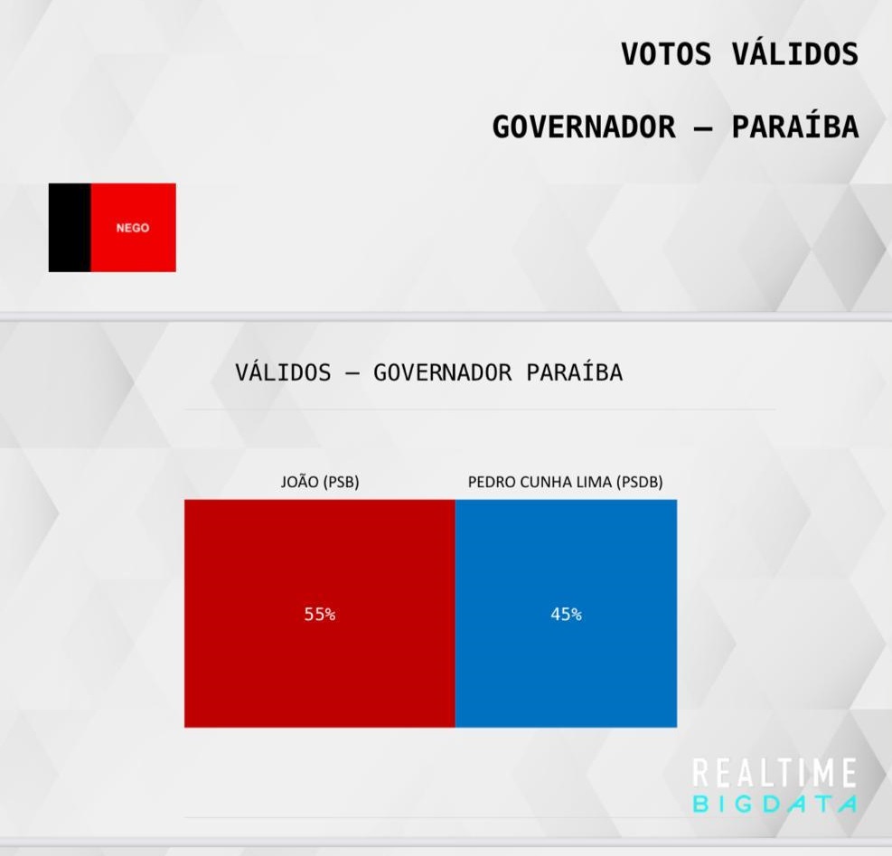 A Pesquisa Real Time Big Data, divulgada nesta terça-feira (11), mostra que a o atual governador da Paraíba e candidato à reeleição, João Azevedo (PSB), lidera as intenções de voto no segundo turno na pesquisa estimulada e nos votos válidos.