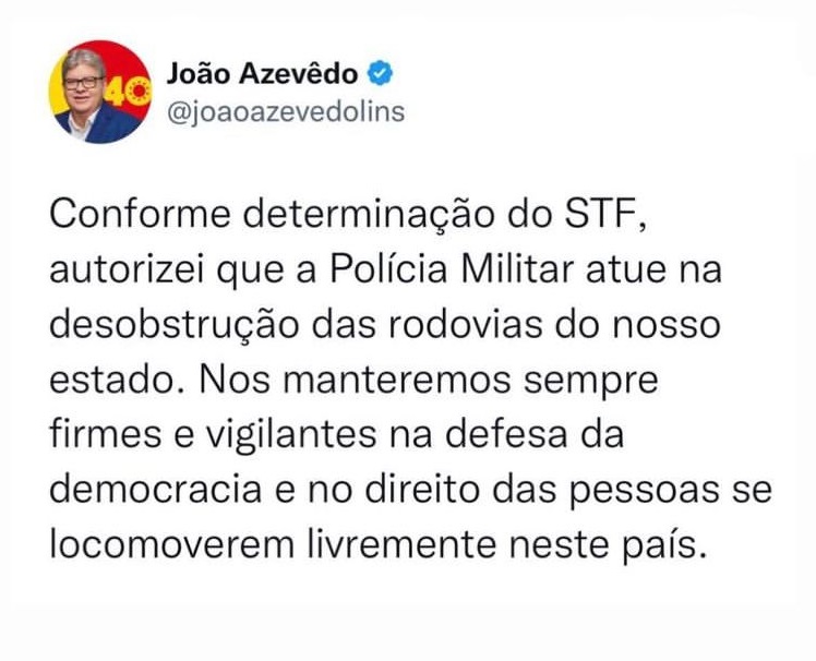 João destacou a importância de defender a democracia e de garantir o direito de locomoção das pessoas. Nesta tarde o atual presidente Jair Bolsonaro condenou os protestos realizados pelos caminhneiros e manifestantes insatisfeito com o resultado das eleições, apesar de compreender a revolta deles