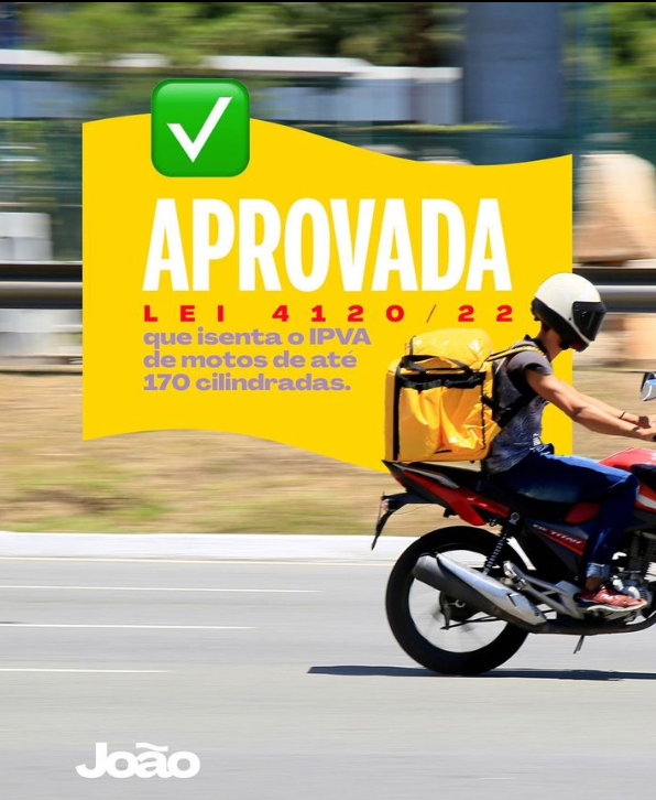O Projeto de Lei (PL) 4.120/2022, de autoria do Governo do Estado, visa atender, principalmente, a população de regiões onde ocorre dificuldade de locomoção, como em áreas rurais de diversos municípios paraibanos. O governador João Azevêdo comemorou a aprovação em seu insagram “Aprovamos, junto à Assembleia Legislativa da Paraíba, o Projeto de Lei 4120/22, que isenta o pagamento de IPVA para motos e demais veículos de duas rodas com até 170 cilindradas. Isso irá beneficiar todas e todos que utilizam desse meio de transporte no dia a dia”.