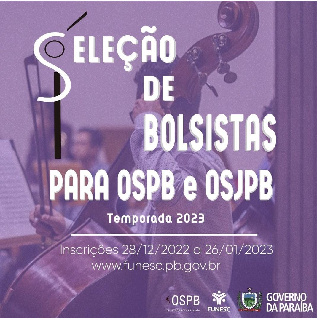 Começaram nesta quarta-feira, 28 de dezembro, as inscrições para seleção de músicos da Orquestra Sinfônica da Paraíba e Orquestra Sinfônica Jovem da Paraíba, que visa compor os quadros dos dois grupos ao longo da temporada 2023, de março a dezembro. Para a profissional, são disponibilizadas 23 vagas e para a Jovem são 70 oportunidades na condição de bolsistas.