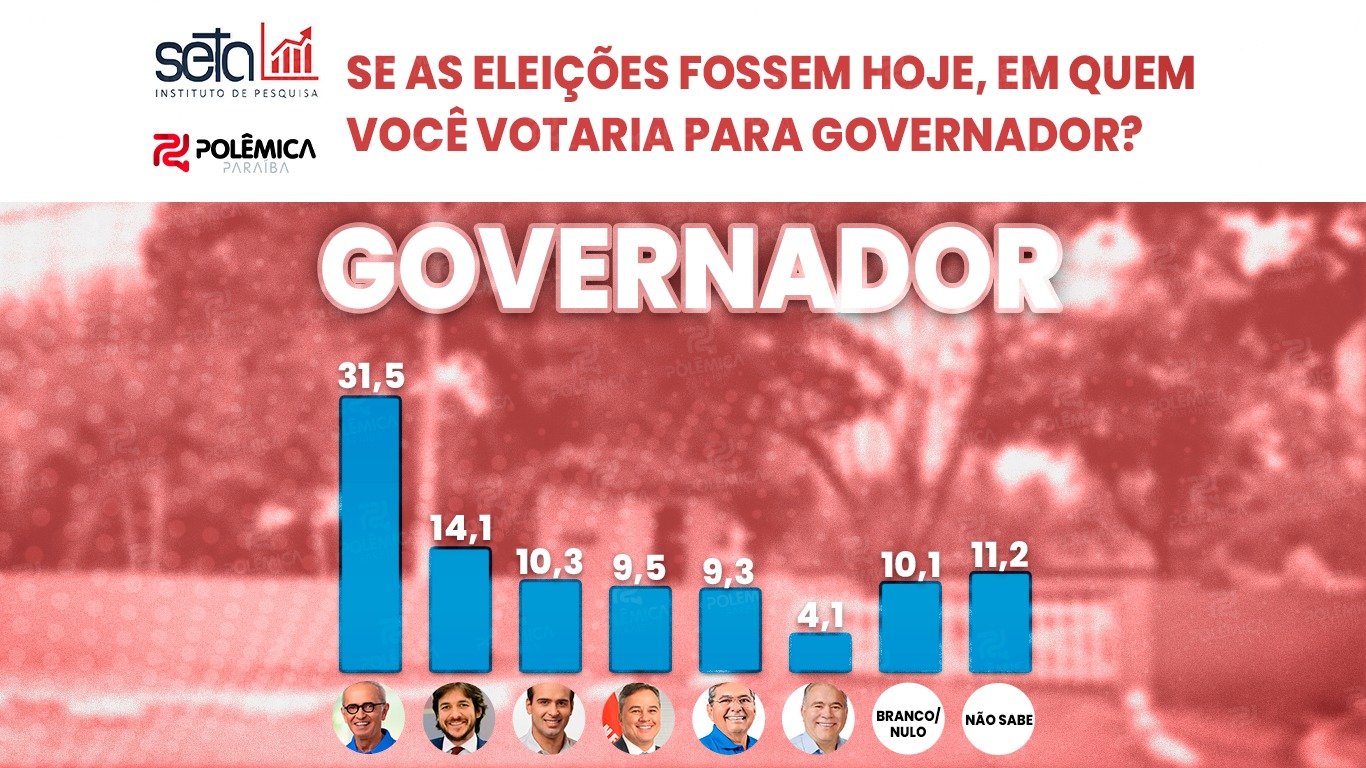 A pergunta que mobiliza o estado: quem será o próximo governador? Em primeiro lugar ficou o atual prefeito de João Pessoa, Cícero Lucena (PP), com 31,5% das intenções de voto. Em segundo lugar aparece Pedro Cunha Lima (PSD), com 14,1%, seguido por Lucas Ribeiro (10,3%) que cresceu significativamente em relação as últimas pesquisas. ,