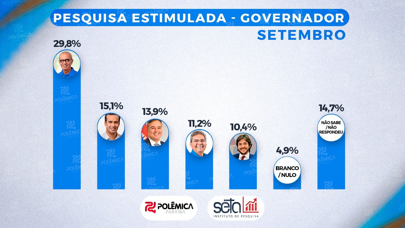 O site Polêmica Paraíba, em parceria exclusiva com o Instituto Seta, apresentou nesta terça-feira (07) o levantamento sobre as preferências eleitorais para o governo da Paraíba em 2026. A um ano da eleição Cícero Lucena aparece em primeiro lugar, com 29,8% das intenções de voto. O vice-governador Lucas Ribeiro (PP) vem em seguida, com 15,1%, crescendo mais de 6% em relação ao último levantamento.