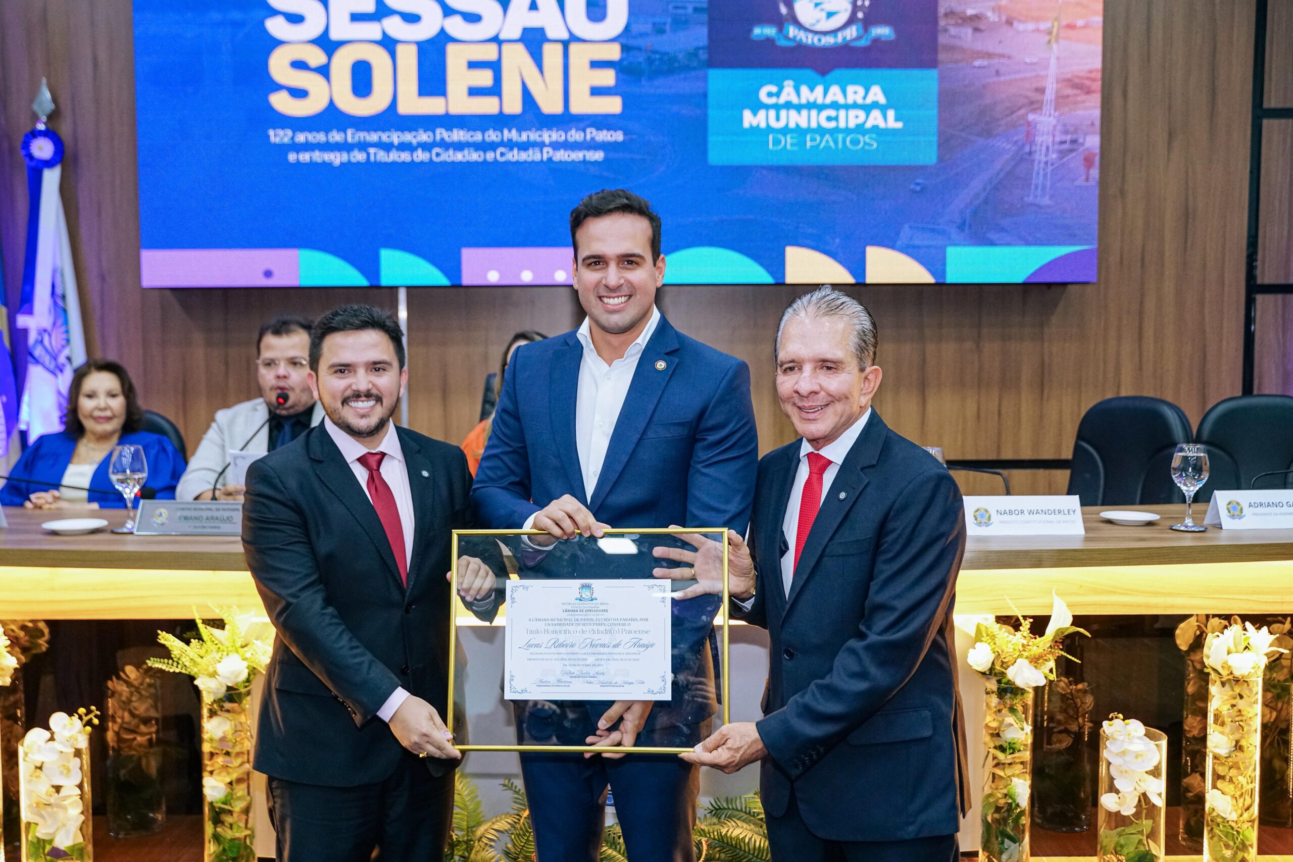 Durante a solenidade, Lucas Ribeiro agradeceu à Câmara pelo reconhecimento e destacou o trabalho que o Governo do Estado vem realizando em parceria com a cidade. “Esse título será guardado não apenas na parede da minha casa, mas também no meu coração. Agradeço à Câmara de Vereadores, em nome da presidente Tide e do vereador Maikon, autor da propositura. Entendo que esse reconhecimento é fruto, principalmente, de um trabalho coletivo, realizado ao lado do governador João Azevêdo, com um governo presente e ações concretas em Patos e em toda a região, como o Hospital de Trauma do Sertão, a reforma e ampliação da Maternidade Dr. Peregrino Filho, a ampliação do Hospital do Bem, a urbanização da Lagoa dos Patos, o novo aeroporto e as unidades habitacionais. São investimentos que refletem o nosso compromisso com o desenvolvimento e com o povo paraibano”, afirmou o governador em exercício.