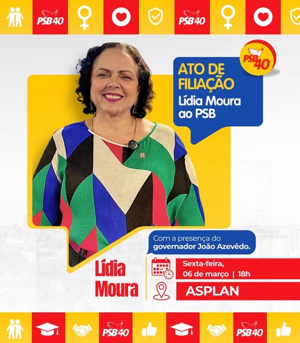 A atual secretária de Estado das Mulheres e da Diversidade Humana da Paraíba, Lídia Moura, vai oficializar sua filiação ao Partido Socialista Brasileiro (PSB) nesta sexta-feira (6). O ato contará com a presença do governador da Paraíba e presidente estadual do partido, João Azevêdo.